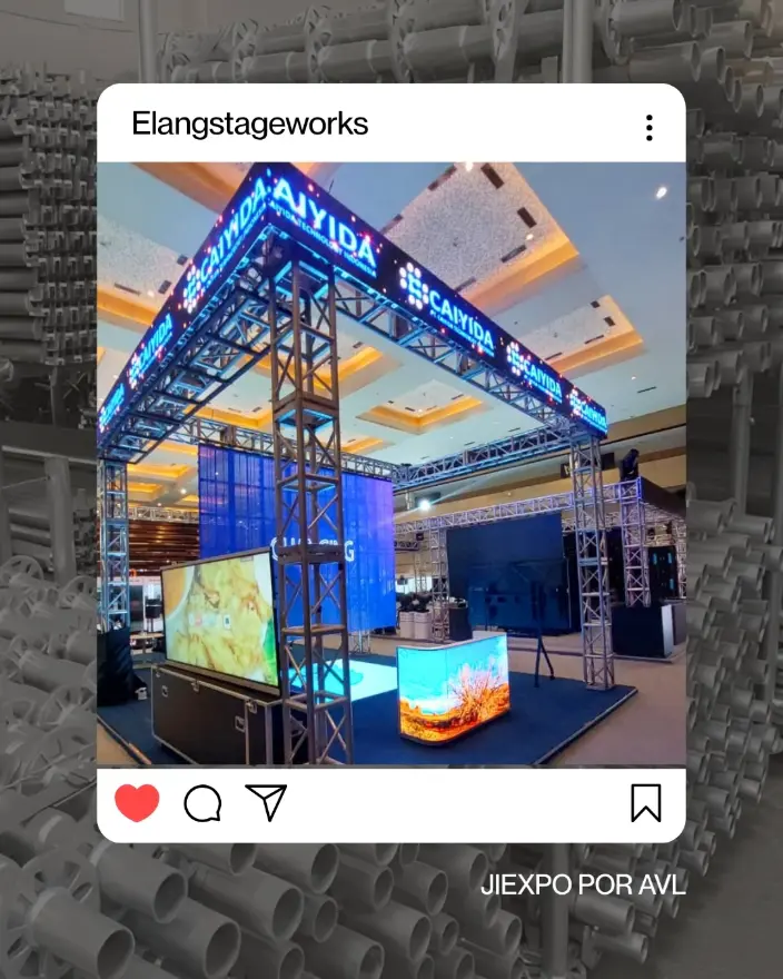 Menggunakan truss aluminium kotak (square truss) yang teruji kekuatannya untuk membangun kerangka atap dan tiang penyangga yang tinggi. Struktur ini menciptakan gate masuk yang dramatis ke area booth utama.